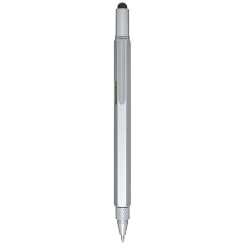 OPIS: Wielofunkcyjny długopis wykonany z aluminium pochodzącego z recyklingu. Funkcje: dwustronna linijka, poziomica, śrubokręt, podziałka, czarny rysik z gumy. Jego korpus pokryty jest srebrną powłoką natryskową, a klips został wykonany z żelaza. Śrubokręt ze stali zapewnia trwałość i wytrzymałość. Dane techniczne: Kolor tuszu: czarny, żywotność: 400 metrów, rozmiar stalówki: 1,0 mm. Ciesz się wszechstronnością w małym wydaniu!