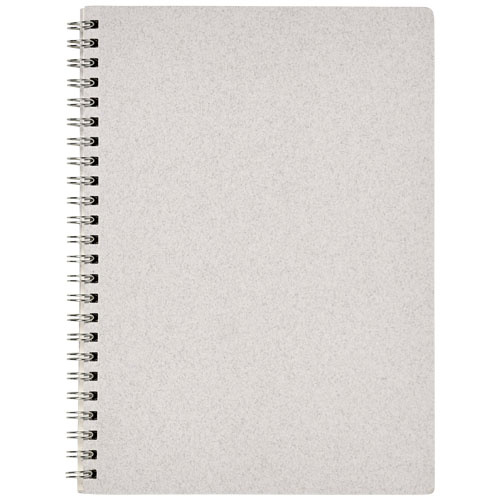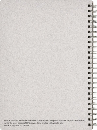 OPIS: Kołozeszyt w formacie A5 z okładką z certyfikatem FSC, wykonaną z odpadów bawełnianych (15%) i pokonsumenckich pochodzących z recyklingu (40%). Zawiera 80 arkuszy z 100% papieru z recyklingu FSC o gramaturze 80 g/m2 z kropkowaną siatką. Kropkowany układ łączy w sobie zalety wyściełanych, gładkich stron w kratkę, zapewniając jednocześnie strukturę i stymulując kreatywność, co sprawia, że zeszyt ten będzie odpowiedni dla szerokiego grona użytkowników. Dzięki spirali, notatnik można rozłożyć na płasko dla wygody użytkowania oraz w łatwy sposób złożyć. Wykonany we Włoszech.
