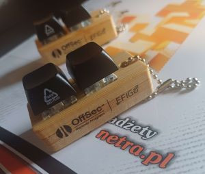 OPIS: Brelok bambusowy z metalowym łańcuszkiem i 2 antystresowymi przyciskami z recyklingowanego ABS, imitującymi przyciski mechanicznej klawiatury.