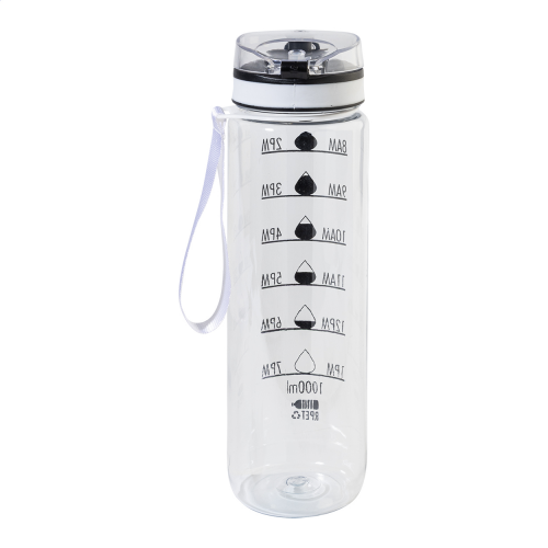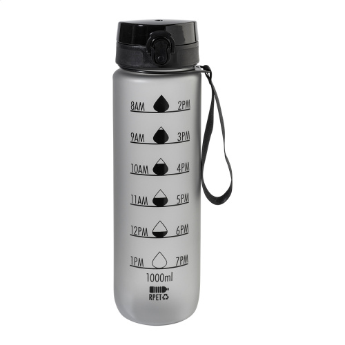 OPIS: Matowa butelka sportowa z tworzywa RPET z motywującym oznaczeniem objętości i czasu, z automatycznie otwieraną klapką z blokadą bezpieczeństwa i paskiem do noszenia. Pojemność 1000 ml. Bez BPA. Nie nadaje się do napojów gazowanych.