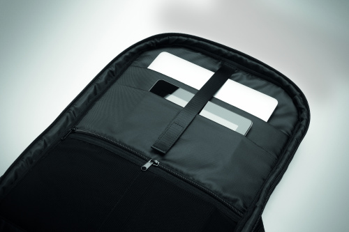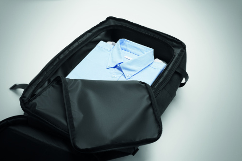 OPIS: Duży, 17-calowy plecak podróżny na laptopa wykonany z poliestru 600D RPET. Posiada kilka przegródek, w tym jedną główną na ubrania, dwie wyściełane na laptopa i tablet. Wyściełany panel tylny, pasek na ramię, uchwyt.