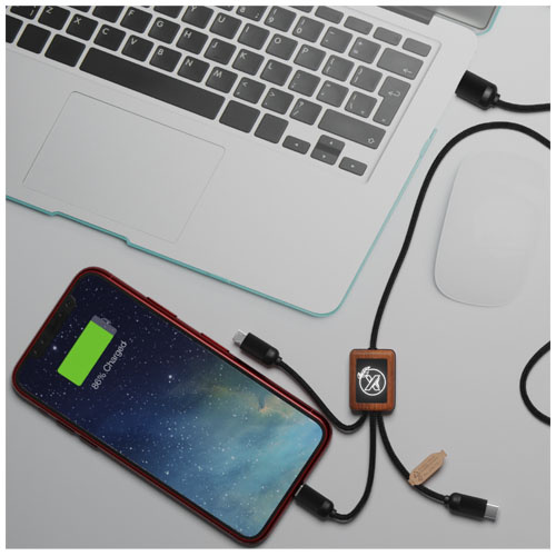 OPIS: Kabel bambusowy 3 w 1 z przewodami o długości 1 metra i 3 złączami (typ C, micro USB, iPhone). Może być ozdobiony podświetlanym logo po obu stronach. Dostarczany w etui z TPU z kartą z papieru Kraft.