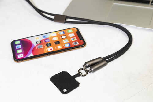 OPIS: Smycz RPET do telefonu z uchwytem na telefon i zintegrowanym kablem ładującym USB-C do USB-C z ukrytymi metalowymi złączami. Obsługuje szybkie ładowanie PD 60 W i przesyłanie danych.