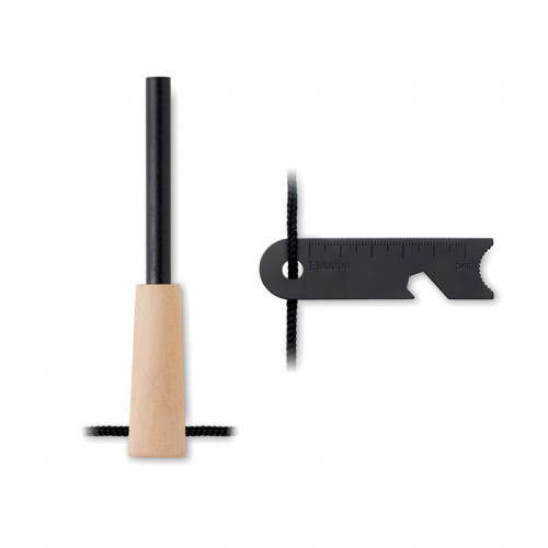 OPIS: Narzędzia do rozpalania ognia wykonane z drewna sosnowego i stali nierdzewnej. Zawiera krzesiwo, wielofunkcyjny skrobak do rozpalania ognia, otwieracz do butelek, precyzyjna linijka i klucz sześciokątny.