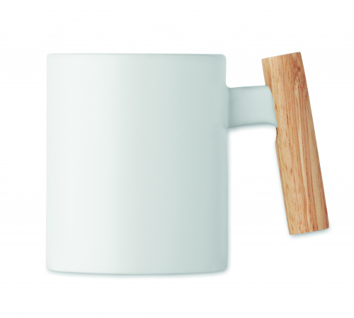 OPIS: Ceramiczny kubek z drewnianym uchwytem. Pojemność: 320 ml. Pakowany pojedynczo w białe pudełko kartonowe.