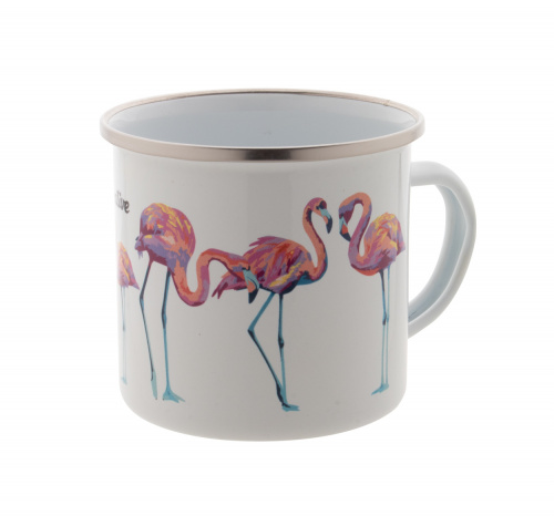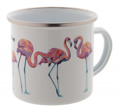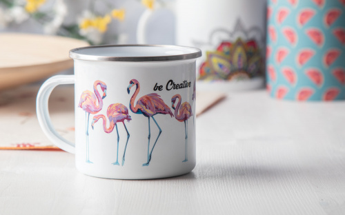 OPIS: Kubek metalowy emaliowany w stylu vintage z obręczą ze stali nierdzewnej, pojemność 300 ml. Kubek pakowany jednostkowo w kartonik biały.