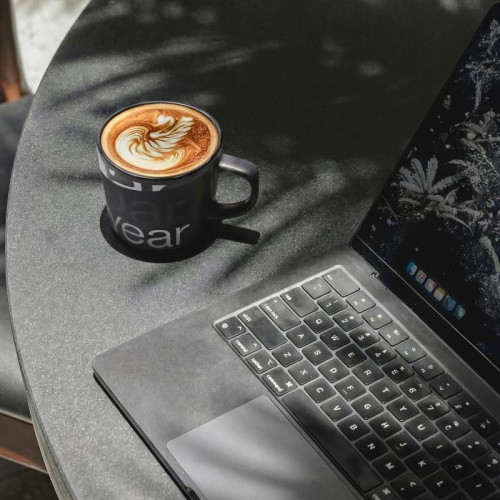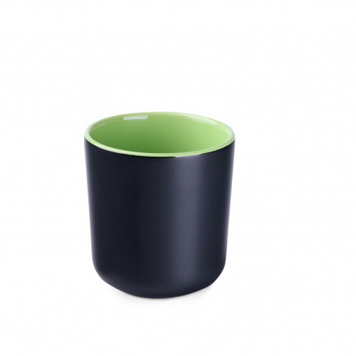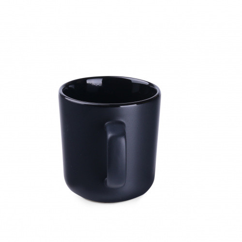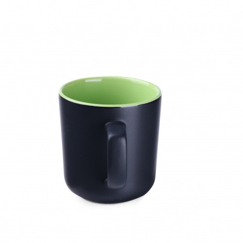 OPIS: Kubek z szerokim polem zadruku. który posiada matową powierzchnię zewnętrzną oraz kolorowy środek. Czarny kubek MAT z nietypowym uchem. O dość dużej powierzchni płaskiej pod znakowanie.