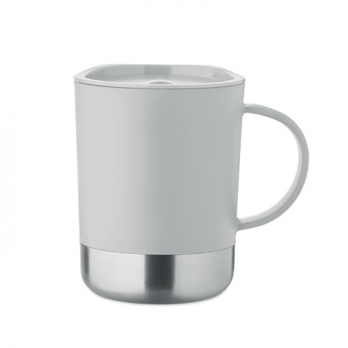 OPIS: Kubek z PP z podstawą z recyklingowanej stali nierdzewnej (90% stali nierdzewnej z recyklingu i 10% stali nierdzewnej) i przesuwaną pokrywką z PP. Pojemność: 300 ml.