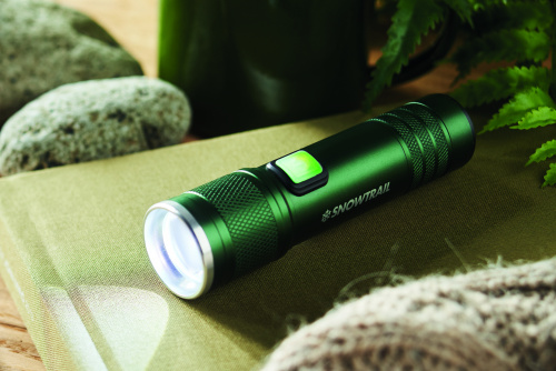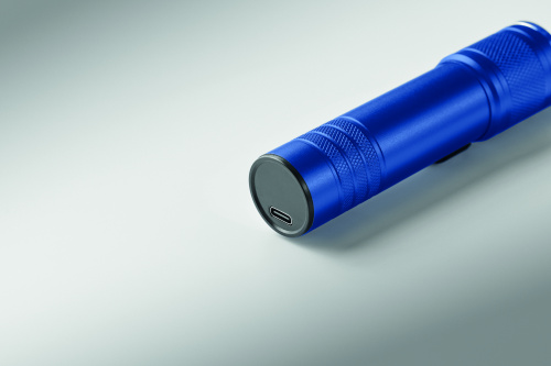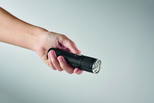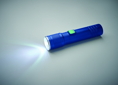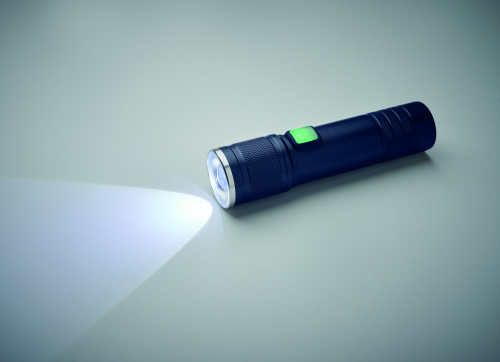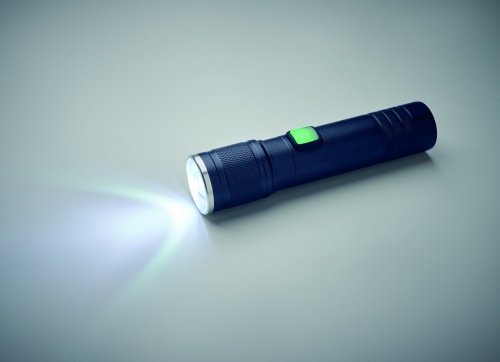 OPIS: Latarka COB z możliwością ładowania, wykonana z aluminium pochodzącego z recyklingu. 100 lumenów z 3 ustawieniami światła i funkcją zoom. Wbudowany akumulator o pojemności 800 mAh. Kabel do ładowania w zestawie.