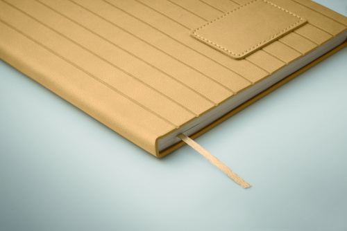 OPIS: Notatnik A5 z miękką, prążkowaną okładką z PU wykonaną w 40% z materiałów pochodzących z recyklingu i w 60% z PU, z gładką naszywką z PU. 160 stron w linie, papier z recyklingu o gramaturze 70 g/m² (80 arkuszy). Dopasowany kolorystycznie znacznik strony z tasiemki.