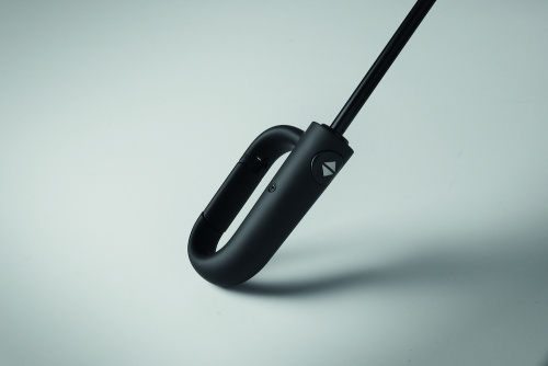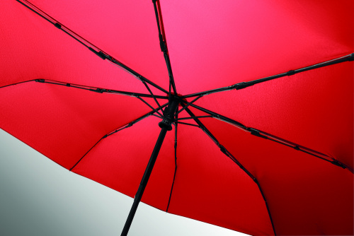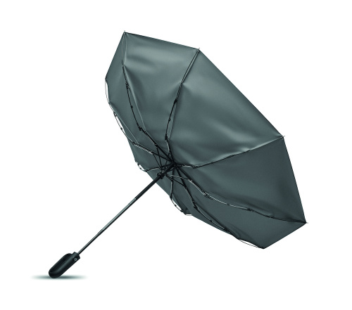 OPIS: Składany 21-calowy wiatroodporny parasol z pełną czarną ramą z włókna szklanego z 2 sekcjami. Żebra z włókna szklanego. Panele pongee 190T RPET. Uchwyt w kształcie litery D z gumowym wykończeniem. Automatyczne otwieranie i zamykanie. W zestawie pokrowiec.