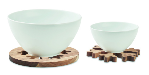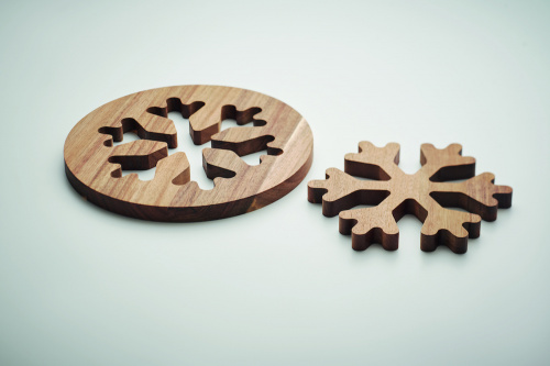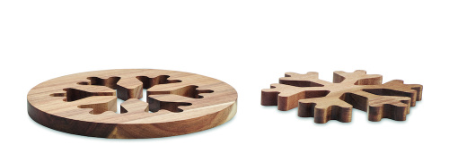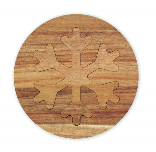 OPIS: Zestaw 2 podstawek pod doniczki z drewna akacjowego z motywem płatka śniegu. Drewno jest produktem naturalnym, dlatego mogą wystąpić nieznaczne różnice w kolorze, wzorze i rozmiarze.