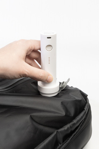 OPIS: Wodoodporny, przedłużany plecak kompresyjny z przegrodami zapinanymi na zamek, wbudowaną próżniową komorą kompresyjną, wyściełaną przegrodą na laptopa (15") i przednią kieszenią zapinaną na zamek. Z bocznymi klamrami, paskiem do wózka, wyściełanym tyłem i paskami na ramiona. Poliester 600D powlekany PU. W zestawie pompka próżniowa z akumulatorem USB (1500 mAh).