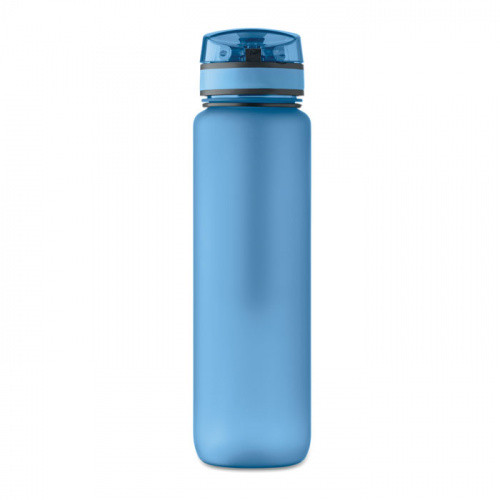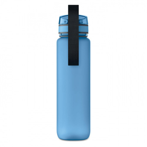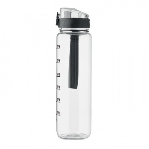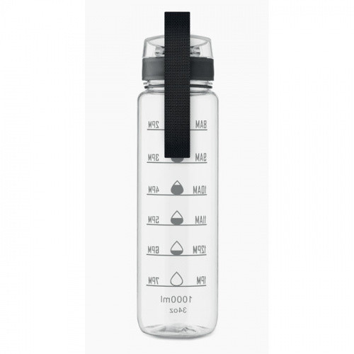 OPIS: Sportowa butelka na wodę z RPET, motywujące oznaczenia czasu, otwierana jedną ręką klapka, blokada bezpieczeństwa i pasek do przenoszenia. Nie przecieka. Pojemność: 1 l.
