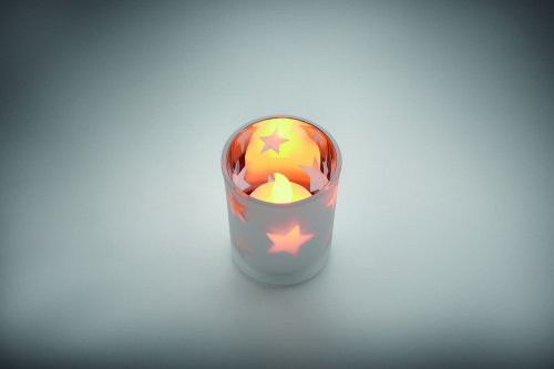 OPIS: Świeczka LED typu tealight z PP w szklanym słoiku. w zestawie 1 bateria CR2032.