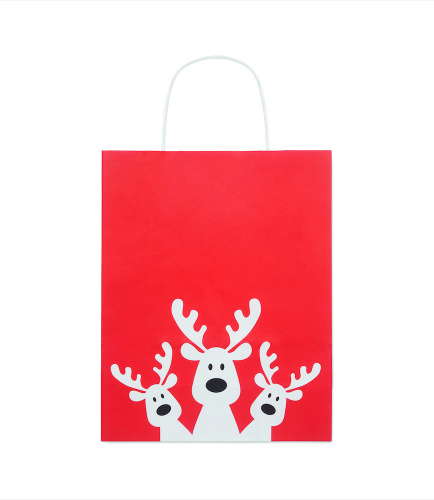 OPIS: Świąteczna mała papierowa torba na prezenty (50% papieru z recyklingu). 90 gr/m². Wyprodukowano w UE.