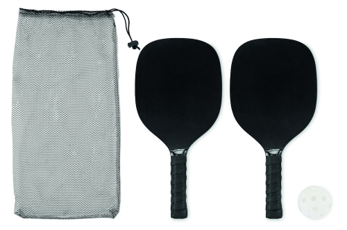 OPIS: Zestaw do gry w Pickleball z 2 drewnianymi rakietkami i 1 piłeczką w pokrowcu z siatki RPET ze sznurkiem.